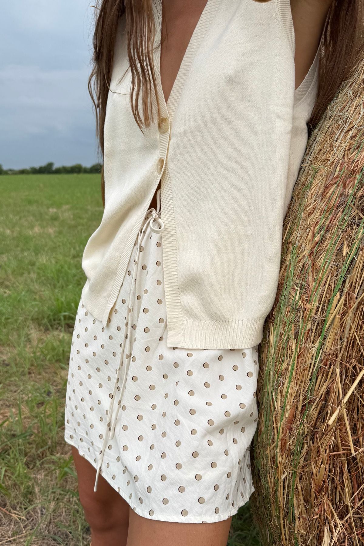 @tessbehannon wears the Goldie Knit Vest + Frannie Silk Mini Skirt